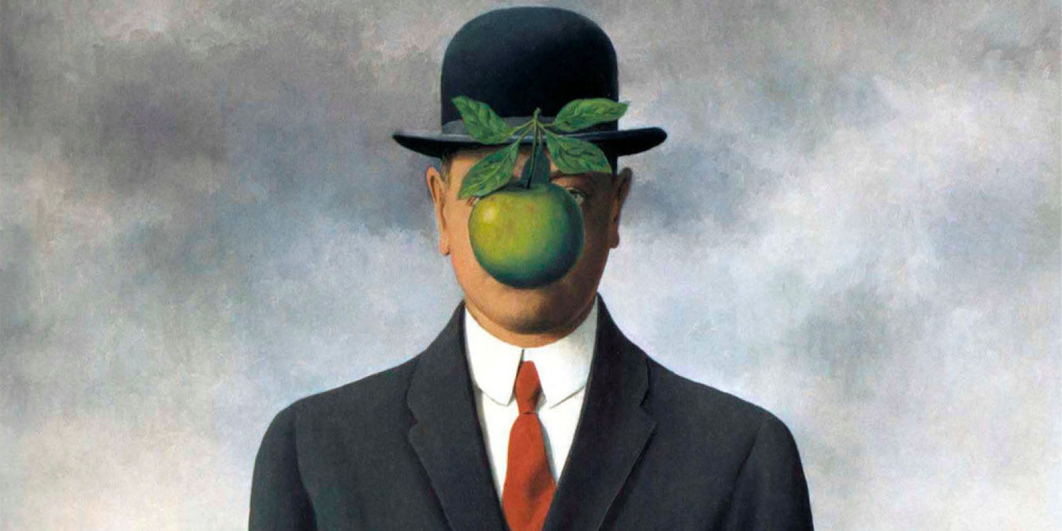 A man whose face is hidden by an apple, facing the sea. A self-portrait of the surrealist painter Magritte, all played on hiding and discovering. About this painting, Magritte said: