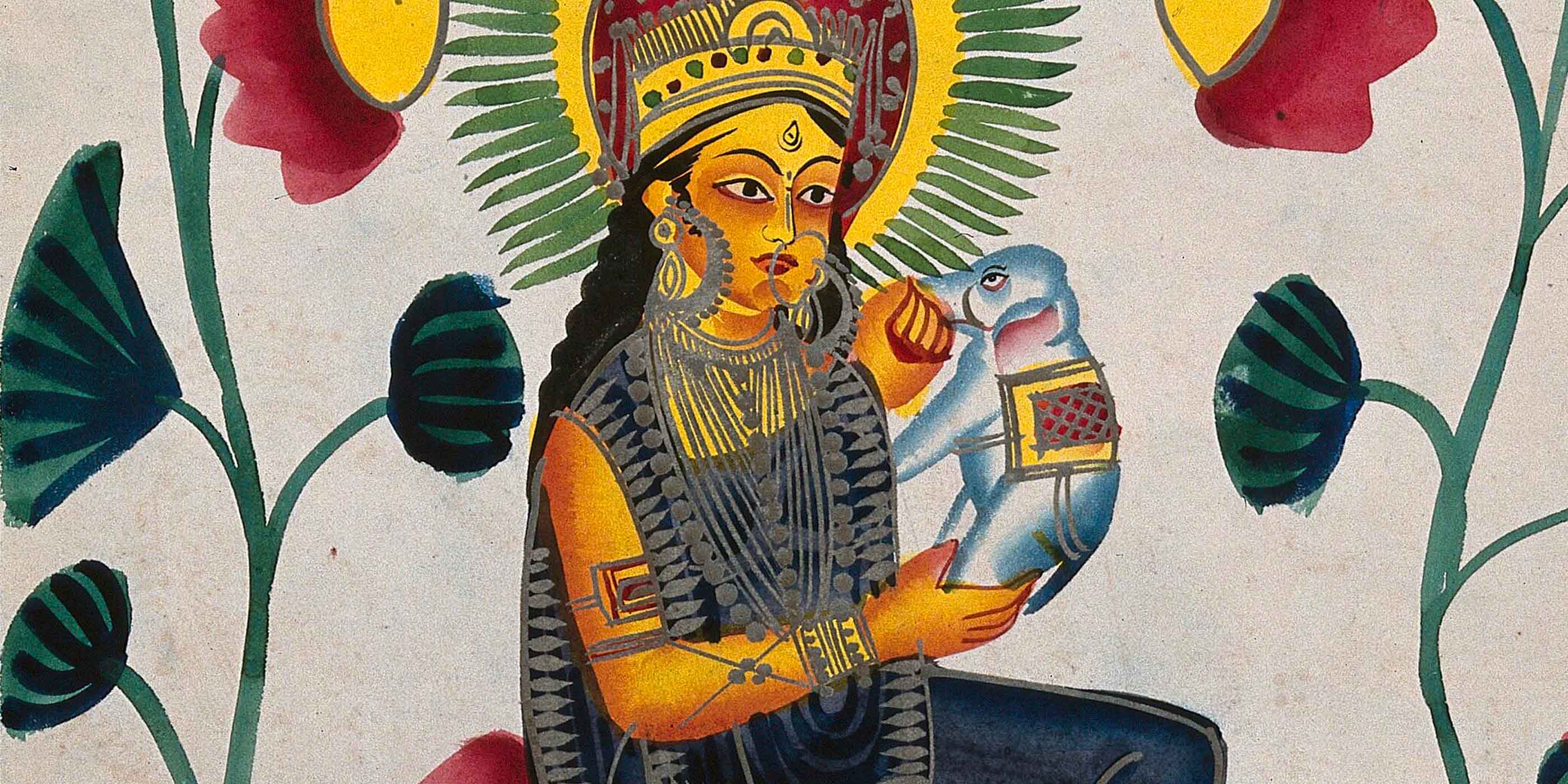Ganesha è il figlio di Shiva e della sua consorte Pārvati, rappresentato con quattro braccia e una testa di elefante mentre cavalca o viene servito da un topo. La Dea raffigurata è probabilmente sua madre, Pārvati, o Lakshmi, la Dea dell’abbondanza, della luce, della saggezza e del destino.
