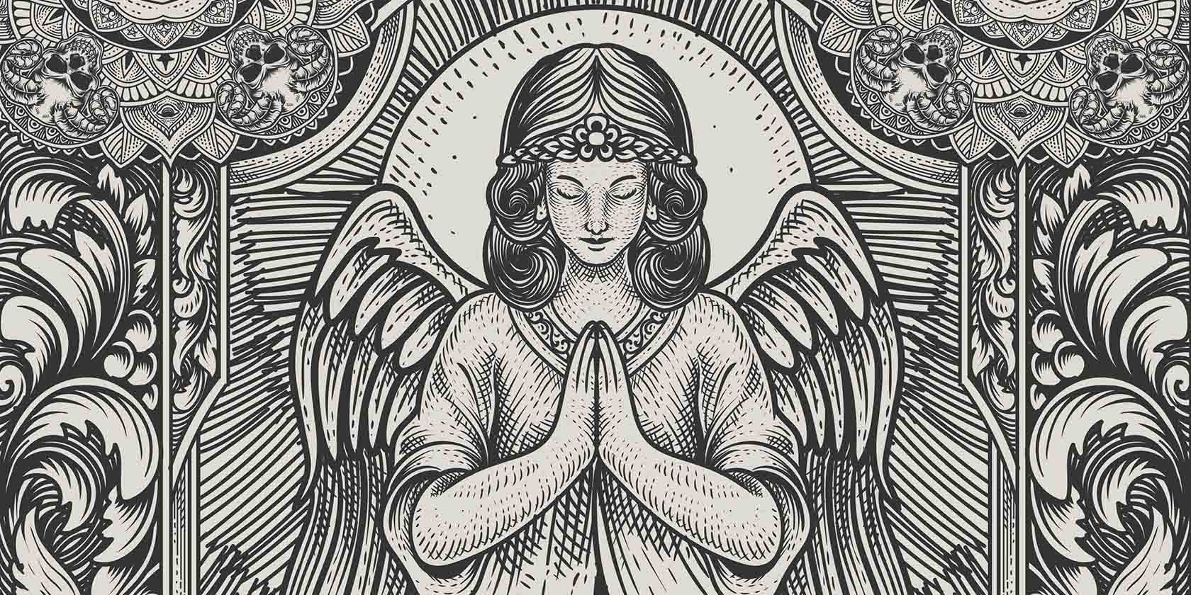 Un bellissimo angelo in meditazione e preghiera, con uno stile unico frutto dell’unione del disegno con la tipografia della pagina, per un risultato che stupirà tutte le persone che lo vedranno.