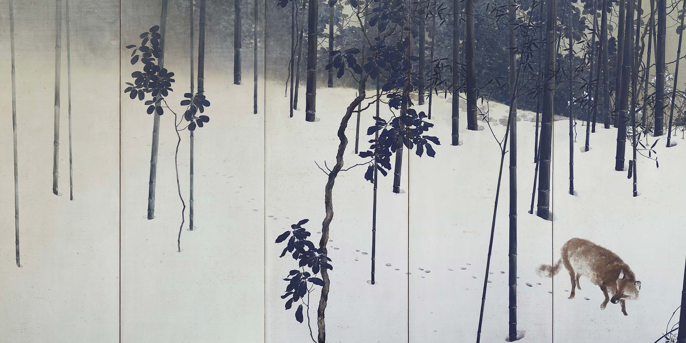 La Volpe sotto la Luna è un dettaglio di un dipinto del pittore giapponese Konoshima Okoku, famoso per le sue immagini della natura, sempre sognanti e minimaliste.