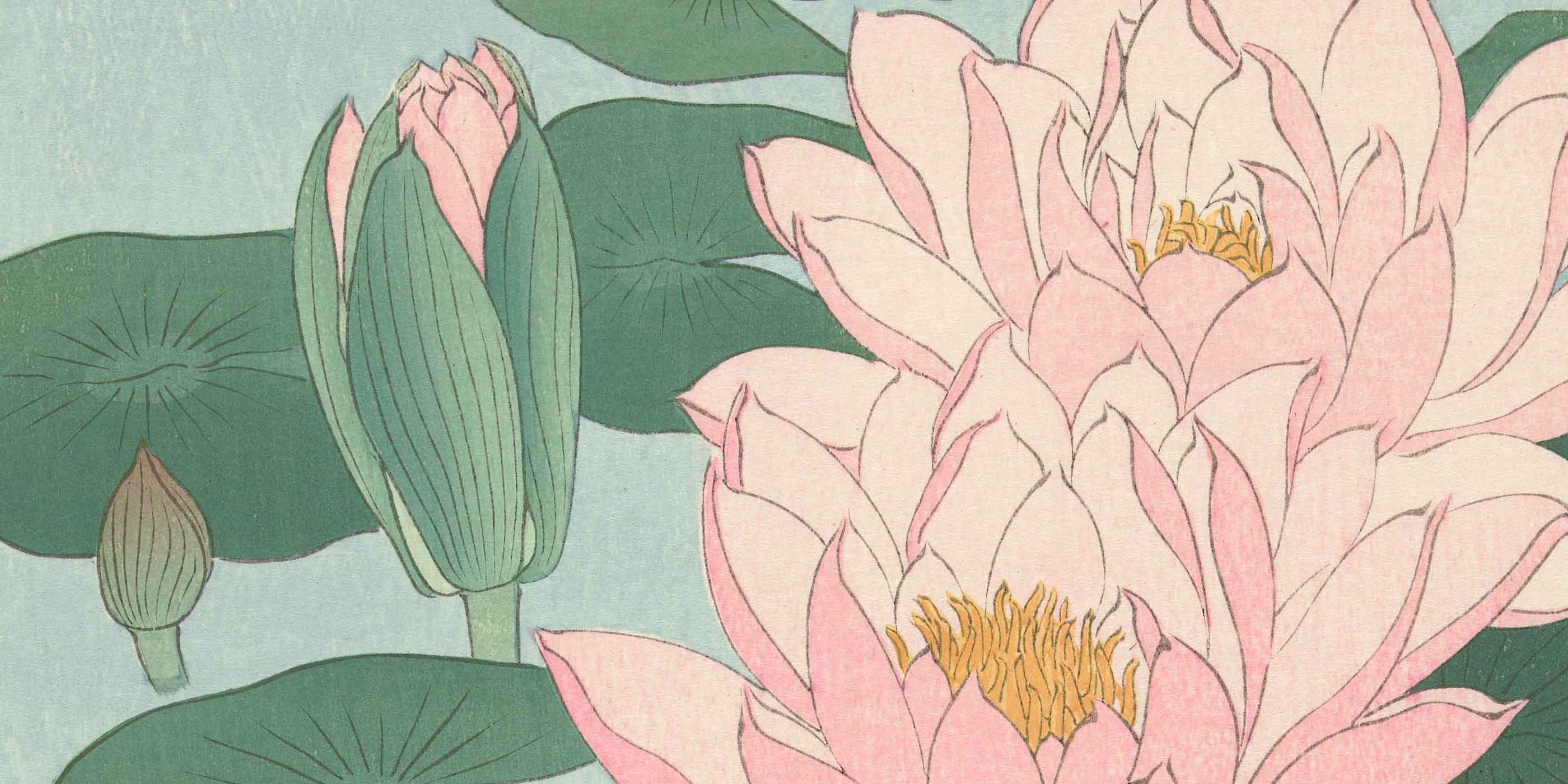 Delizioso dipinto di ninfee rosa nell’acqua, del pittore e disegnatore giapponese Ohara Koson, vissuto tra il 1800 e il 1900. L’originale è conservato presso il Rijksmuseum di Amsterdam, nei Paesi Bassi.